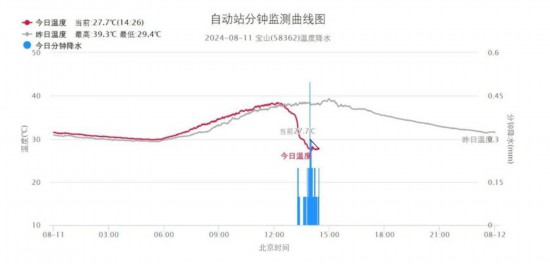 炙熱的天氣在午后風云突變。上海中心氣象臺雷電、暴雨、大風預警信號齊發。隨著對流云團活躍,中心城區北部、浦東北部、寶山、嘉定、松江、青浦等地出現雷陣雨,并伴有短時強降水和雷雨大風。統計顯示,寶山淞南鎮降雨量最大,為99.5毫米,松江小昆山鎮出現最大8級陣風。大雨帶走酷暑,氣溫在短時間內急劇降低,寶山甚至降溫達到約10℃。