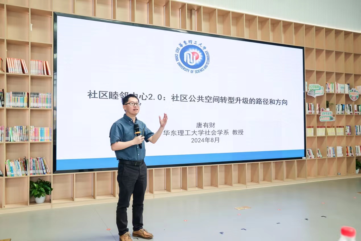 隨后,2024楊浦睦鄰蓬勃計劃之匯智創新行動的首堂公開課拉開序幕。楊浦區社區治理顧問、華東理工大學社會與公共管理學院教授唐有財圍繞“黨建引領基層治理背景下社區睦鄰中心功能升級”進行了分享。