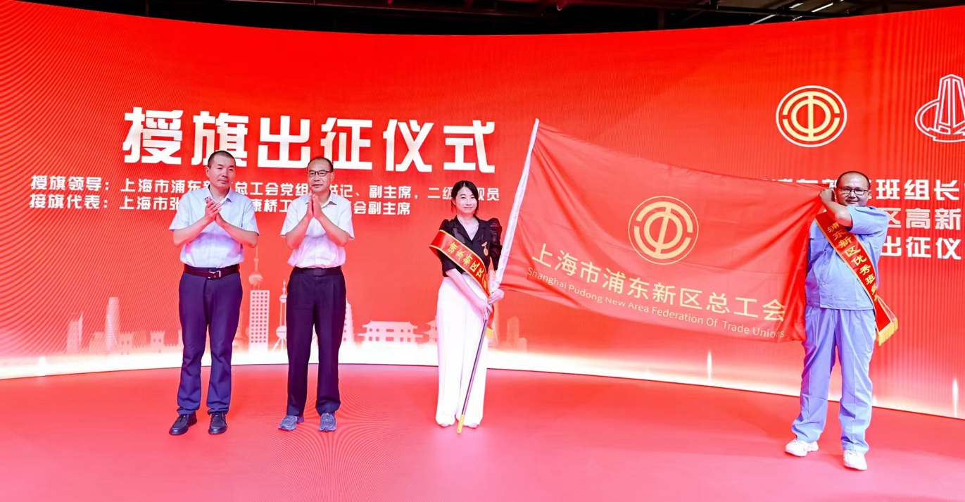 浦東新區總工會黨組副書記、副主席、二級巡視員溫映瑞將象征著光榮與責任的旗幟鄭重交給接旗人——張江科學城康橋工業區總工會副主席孫柏順,這也標志著浦東代表隊正式出征國家級班組長管理技能大賽。