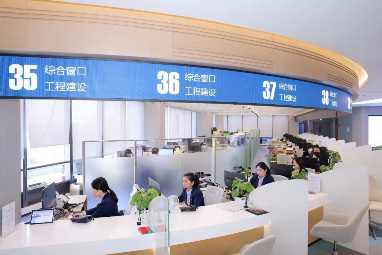 政務服務中心坐落于滴水湖地鐵站旁,門口掛著“全國巾幗文明崗”“上海市工人先鋒號”“臨港新片區青年文明號”榮譽獎牌,筆者跟隨著上午九點的陽光走進玻璃旋轉門,一排窗口弧形排開,光潔的地面、亮堂的視野、舒適的沙發、身著統一制服的工作人員熱情的微笑……