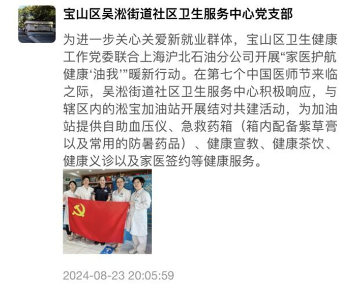 在第七個中國醫師節來臨之際,吳淞街道社區衛生服務中心積極響應,與轄區內的淞寶加油站開展結對共建活動,為加油站提供自助血壓儀、急救藥箱、健康宣教、健康茶飲、健康義診以及家醫簽約等健康服務。