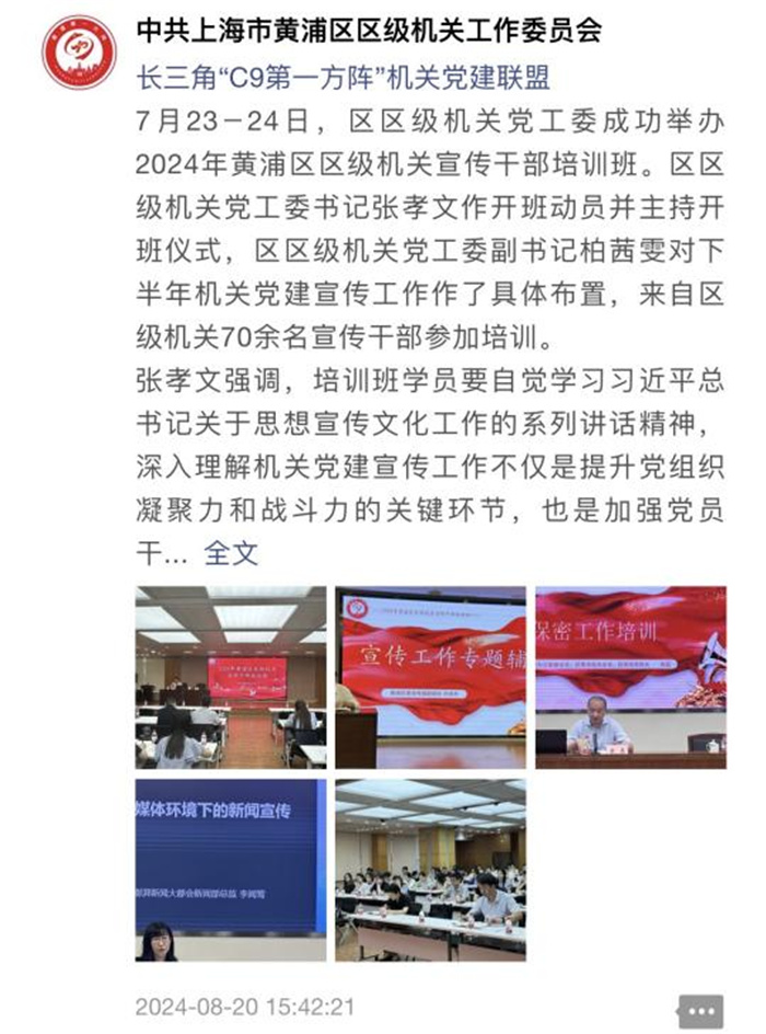 近日,黃浦區區區級機關黨工委成功舉辦2024年黃浦區區級機關宣傳干部培訓班,來自區級機關70余名宣傳干部參加培訓。