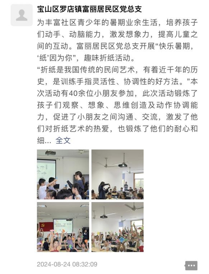 為豐富社區青少年的暑期業余生活,培養孩子們動手、動腦能力,激發想象力,提高兒童之間的互動。富麗居民區黨總支開展“快樂暑期,‘紙’因為你”,趣味折紙活動。