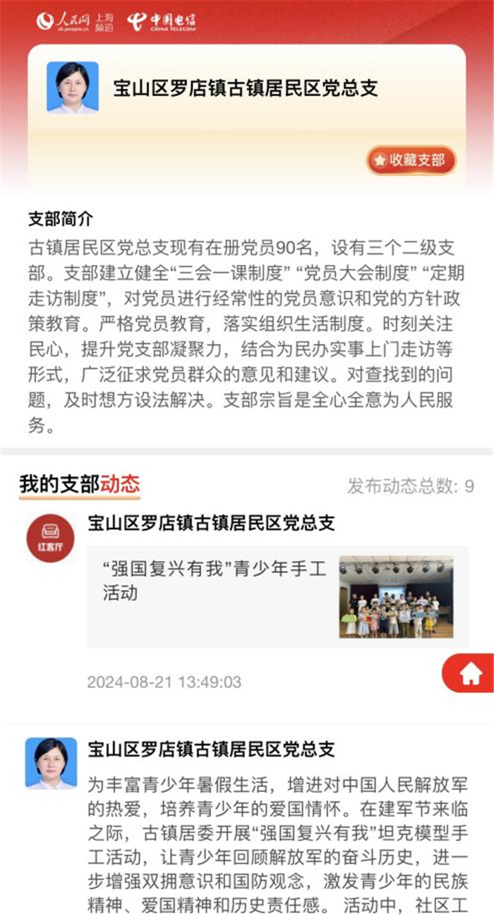 5、寶山區羅店鎮古鎮居民區黨總支,已發布動態9條,8月發布動態6條。