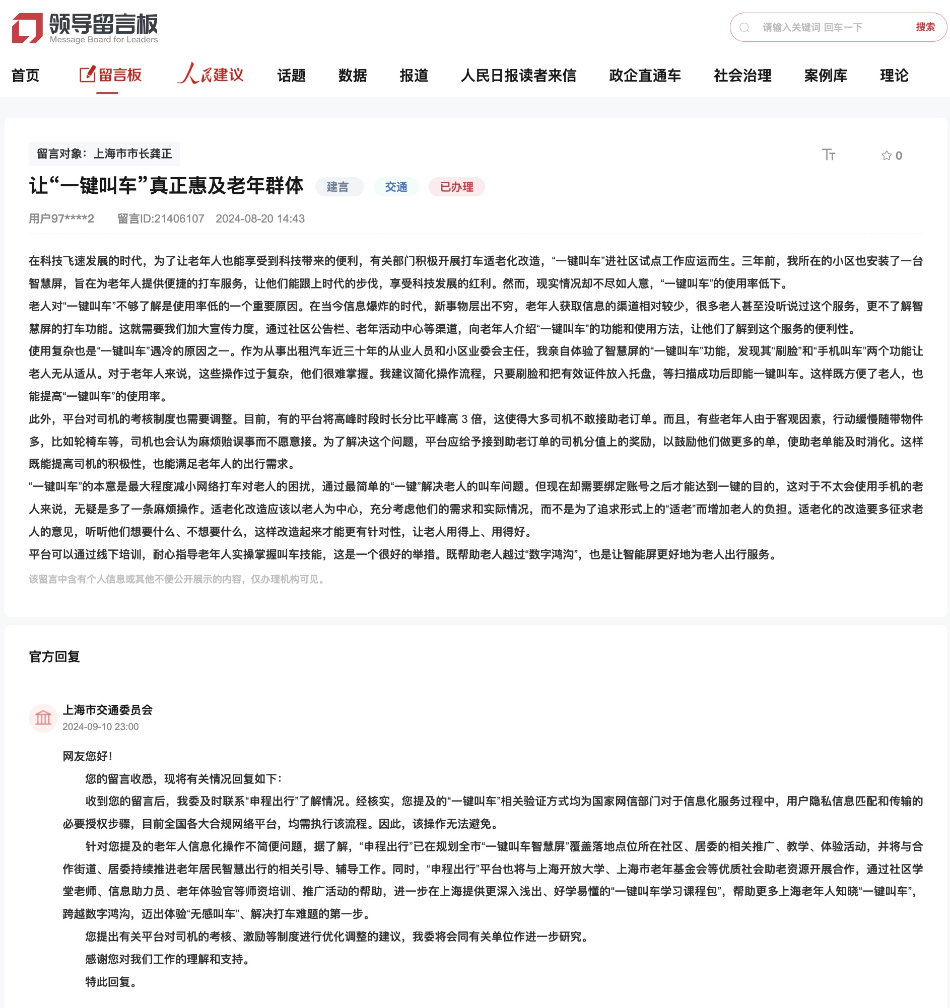 近日,有網友通過人民網“領導留言板”留言,希望能夠真正提升服務,減少“數字鴻溝”,讓上海市老年人真正能享受到“一鍵叫車”。