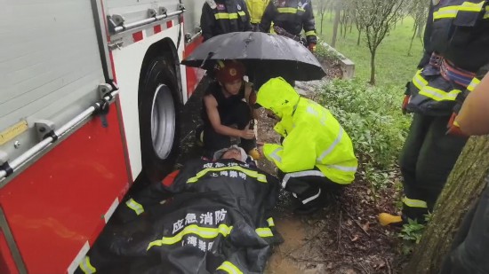 崇明消防救援被樹木砸倒的老人。崇明消防供圖