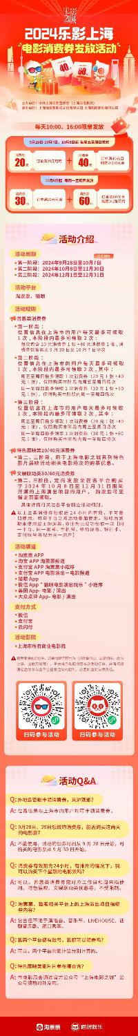 堅持讓利于民、補貼惠民的原則,創新票補方式。在以往單人單券的基礎上,新推出雙人同行消費券,為情侶、親友、家庭等用戶領券購票提供便利。此外,根據上海特點和觀眾需求,配置了特色消費券,進一步挖掘市場潛力。在內容方面,活動期間《志愿軍:存亡之戰》等國慶檔重點影片以及《變形金剛:起源》《毒液:最后一舞》等海外進口大片都將陸續上映,吸引不同年齡層次的觀眾走進電影院,讓在滬影迷們充分感受“電影之城”的魅力。
