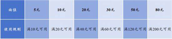 (一)券面規則。共推出四種面額。一是50元面額,餐飲消費滿300元每次抵用一張;二是100元面額,餐飲消費滿500元每次抵用一張;三是200元面額,餐飲消費滿800元每次抵用一張;四是300元面額,餐飲消費滿1000元每次抵用一張。