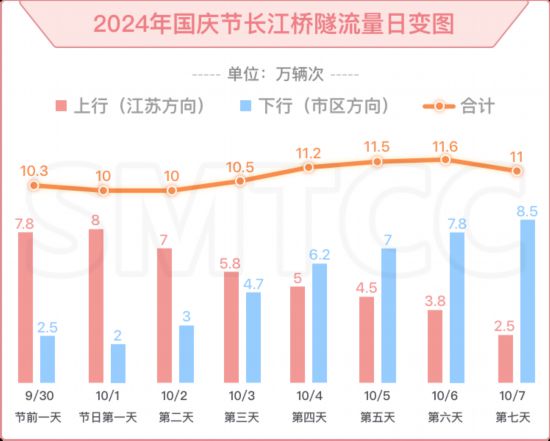 預計G40滬陜高速長江隧道日均流量達10.8萬輛次,同比增長約3%。其中上行(江蘇方向)5.2萬輛次,下行(市區方向)5.6萬輛次。節日期間長江隧道流量最大時段為8時至11時、14時-17時,平均小時流量達5800輛次。