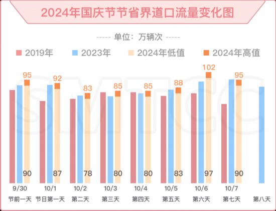 預計國慶節期間,高速及地面省界道口日均流量達85-90萬輛次,較2023年中秋國慶雙節增長在3%以內,較2019年同期上升6%-12%。