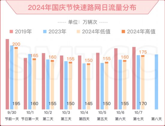 預計國慶節期間,高速公路日均流量達155-160萬輛次,較2023年中秋國慶雙節增長在5%以內,較2019年同期上升15%-19%。