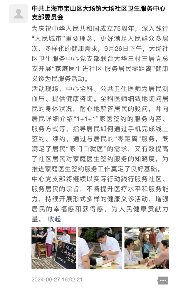 9月26日下午,大場社區衛生服務中心黨支部聯合大華三村三居黨總支開展“家庭醫生進社區 服務居民零距離”健康義診為民服務活動。