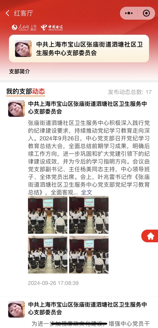 3、中共上海市寶山區張廟街道泗塘社區衛生服務中心支部委員會,已發布動態 17條,9月發布動態3條。