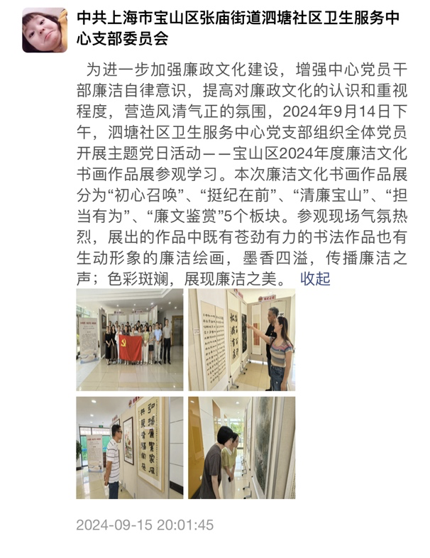 9月14日下午,泗塘社區衛生服務中心黨支部組織全體黨員開展主題黨日活動——寶山區2024年度廉潔文化書畫作品展參觀學習。