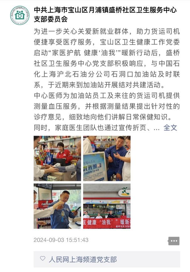 為進一步關心關愛新就業群體,助力貨運司機便捷享受醫療服務,寶山區衛生健康工作黨委啟動“家醫護航 健康‘油我’”暖新行動后,盛橋社區衛生服務中心黨支部積極響應,與中國石化上海滬北石油分公司石洞口加油站及時聯系,于近期來到加油站開展結對共建活動。