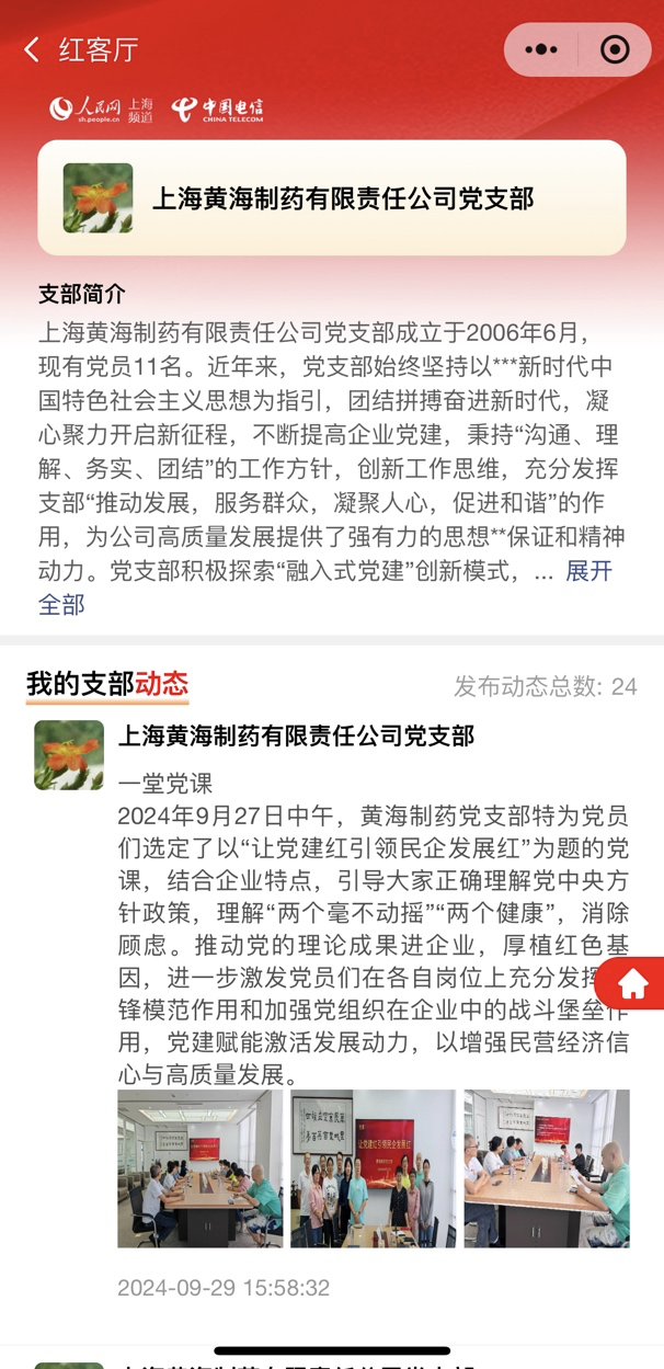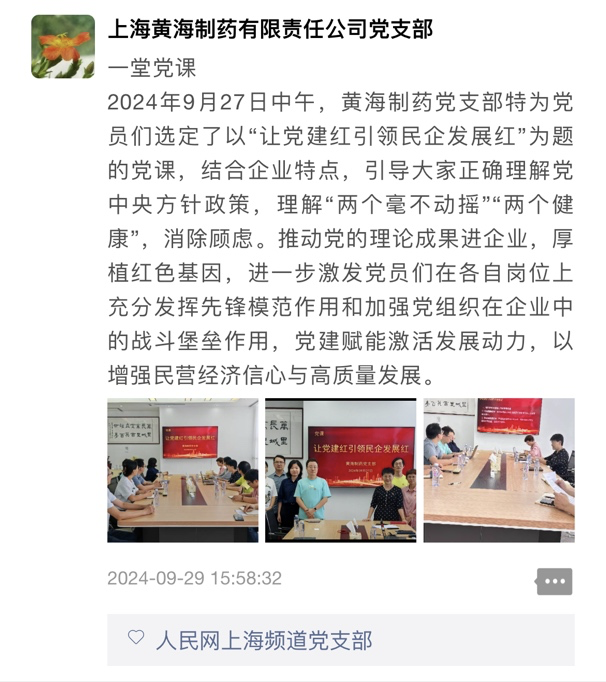 5、上海黃海制藥有限責任公司黨支部,已發布動態24條,9月發布動態3條。