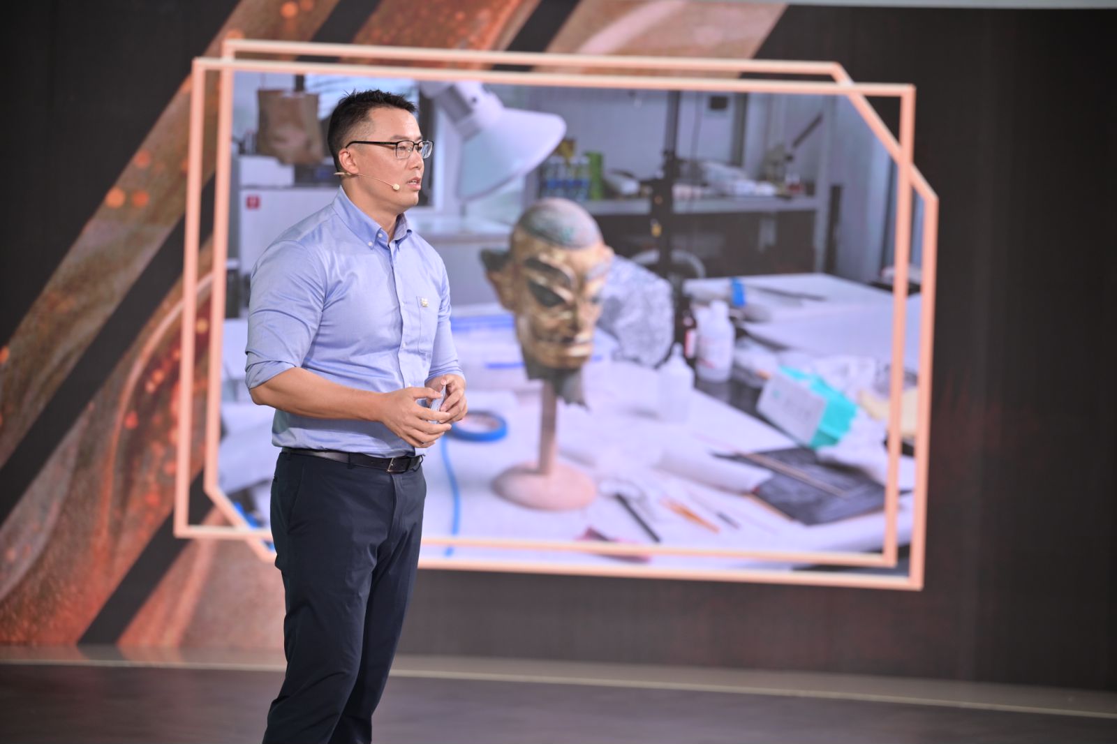 “今年年初,上海博物館東館的開館大展‘星耀中國——三星堆·金沙古蜀文明展’上的‘金面具笄發青銅人頭像’,就是我經手修復的國寶級文物之一?!薄拔奈镝t生”張珮琛講述著上海博物館文物保護科技中心如何修文物的故事。