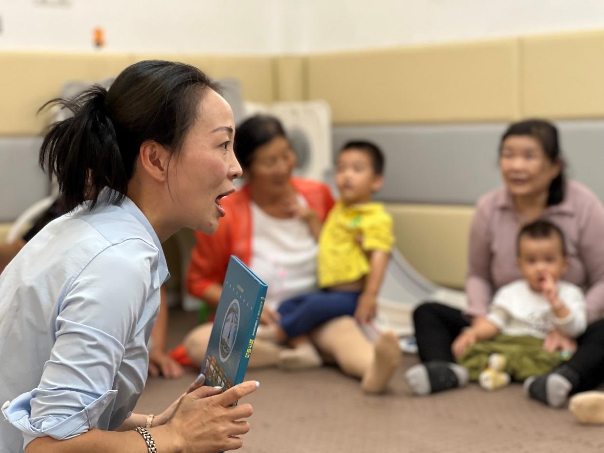 “有一個月亮在水里面。不好了不好了,大事不好了,月亮掉到井里了!”脫下鞋子、“放飛雙腳”,“寶寶屋”內,十幾個萌娃坐在家長的懷抱里,跟著老師讀繪本《猴子撈月》。