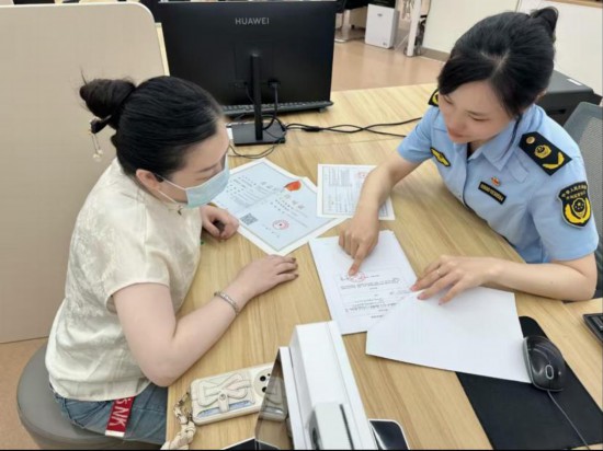 上海市市場監管局工作人員對企業辦事人員進行窗口指導。上海市市場監管局供圖