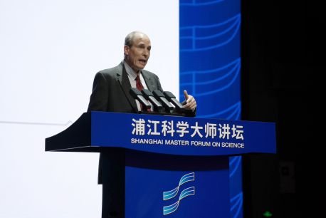 10月21日上午,內森斯受邀來到復旦大學相輝堂,走上復旦·浦江科學大師講壇。這是他第一次來中國,他選擇系了一條紅色領帶。