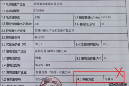 4.看一致性。查看配備的充電器、蓄電池生產企業、型號規格等是否與整車合格證標注的一致。