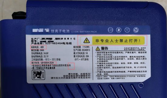 3.看鋰電池。查看鋰電池標識是否注明執行標準(GB 43854-2024) ;是否標注生產廠、型號、充放電參數、安全警示說明、安全使用年限等信息;標稱電壓不應大于48V;電池組應有唯一性編碼,編碼標識應采用耐高溫材質。