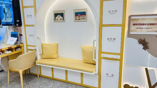 這是一家銀行養老服務示范網點。一進門,她就感到這家網點有些不一樣——“阿姨,您辦什么業務?”“您這邊先坐著休息一下?!便y行工作人員說話輕聲細語;墻上的儲物格里,顯眼地標識著助聽器、拐杖、老花鏡等助老設施;椅子高度也低了一些,方便老人就座。