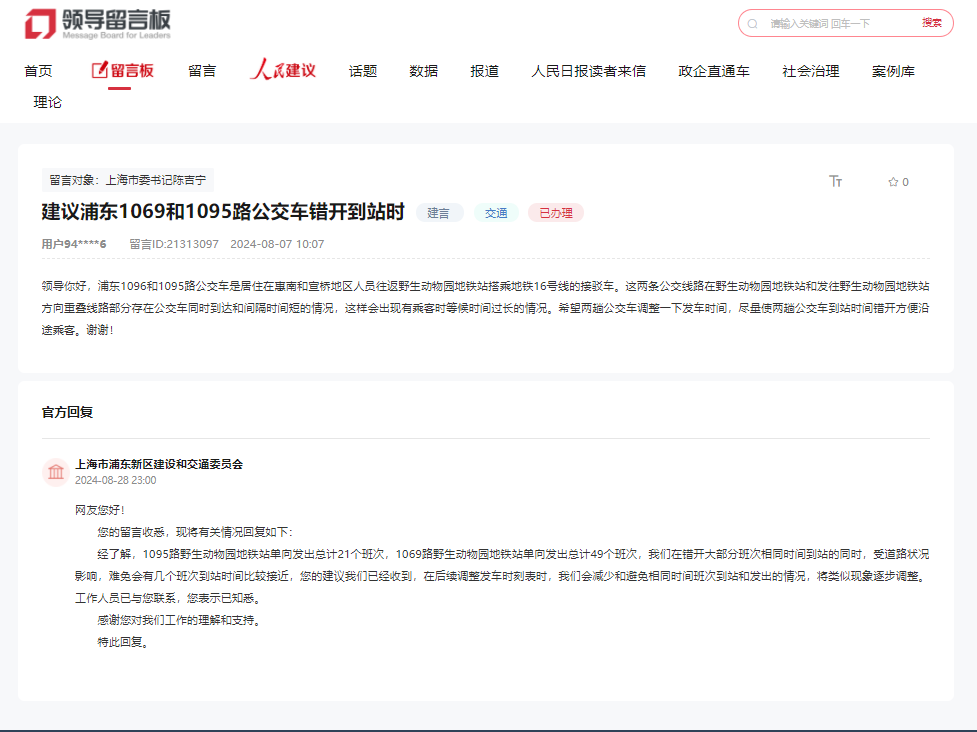 人民網上海11月15日電(記者龔莎)日前,有上海網友通過人民網“領導留言板”反映,浦東1096和1095路公交車最后一公里接駁車扎堆到站,希望調整兩趟公交車發車時間。收悉留言后,上海市浦東新區建設和交通委員會就網友提出的問題作出回復。