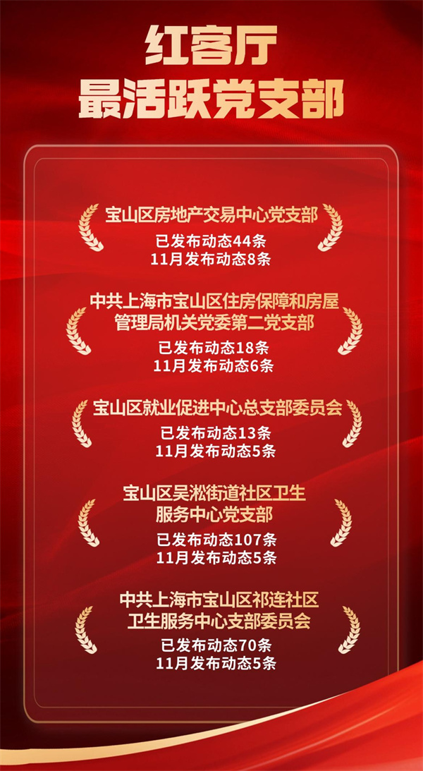 據“紅客廳”后臺數據顯示,自11月1日至11月30日,共有36個支部發布92條支部圈動態,其中,寶山區房地產交易中心黨支部、寶山區住房保障和房屋管理局機關黨委第二黨支部、寶山區就業促進中心總支部委員會、寶山區吳淞街道社區衛生服務中心黨支部、中共上海市寶山區祁連社區衛生服務中心支部委員會成為本月紅客廳活躍黨支部。