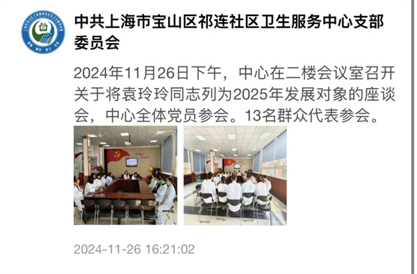2024年11月26日下午,中心在二樓會議室召開關于將袁玲玲同志列為2025年發展對象的座談會,中心全體黨員參會。13名群眾代表參會。