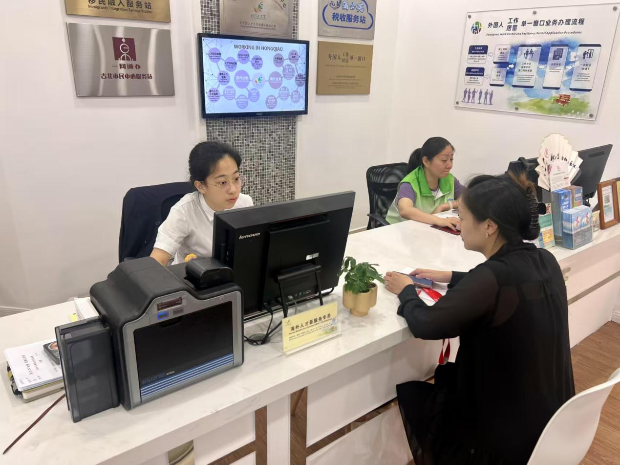 據工作人員介紹,虹橋人才薈古北市民中心站首創“五站合一”政務融合服務站,即境外人員服務站、移民融入服務站、外國人工作-居留“單一窗口”、蒲公英雙語稅收服務站、“一網通辦”古北市民中心服務站,使海內外人士在“家門口”就能“辦成事”。