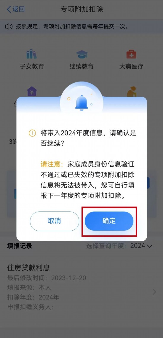點擊【確認下一年度專項附加扣除】“一鍵帶入”,依據提示“將帶入2024年度信息,請確認是否繼續?”,確認后點擊“確定”。
