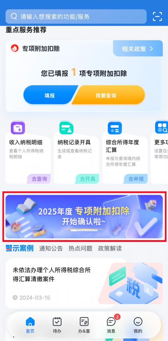 登錄個人所得稅App,點擊首頁“2025年度專項附加扣除開始確認啦”——“去確認”進入功能界面;通過“首頁”——“辦&查”——“專項附加扣除”進入功能界面。