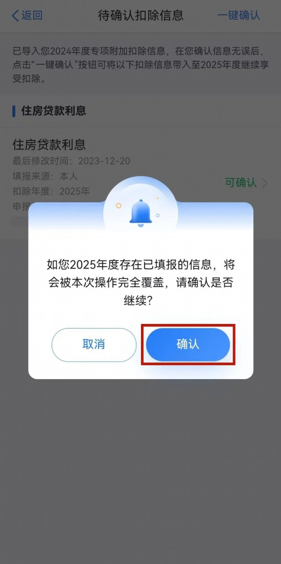 進入待確認扣除信息界面,點擊“可確認”核對信息,完成信息確認后,點擊“一鍵確認”,系統將提示您本次填寫的信息會對2025年度已填報的信息完成覆蓋,確認無誤點擊“確認”,即可完成提交。