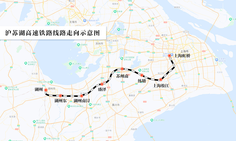 滬蘇湖高鐵是長三角地區城際軌道交通網的骨干線路。項目起自上海虹橋站,途經江蘇省蘇州市,接入浙江省湖州市湖州站,線路全長164公里,設計時速350公里,設上海虹橋、上海松江、練塘、蘇州南、盛澤、湖州南潯、湖州東、湖州站等8座車站,其中上海虹橋、湖州站為既有車站,其余為新建車站。