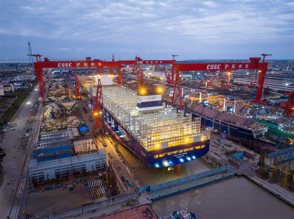 打造新一代“海上綠巨人”。11月20日,滬東中華建造的全球最大24000箱級LNG雙燃料動力超大型集裝箱船首制船順利出塢,成為全球新一代“海上綠巨人”。