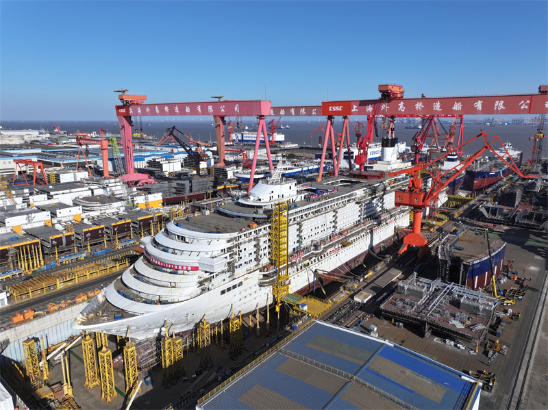 第二艘國產大型郵輪“愛達·花城號”全船貫通。外高橋造船供圖