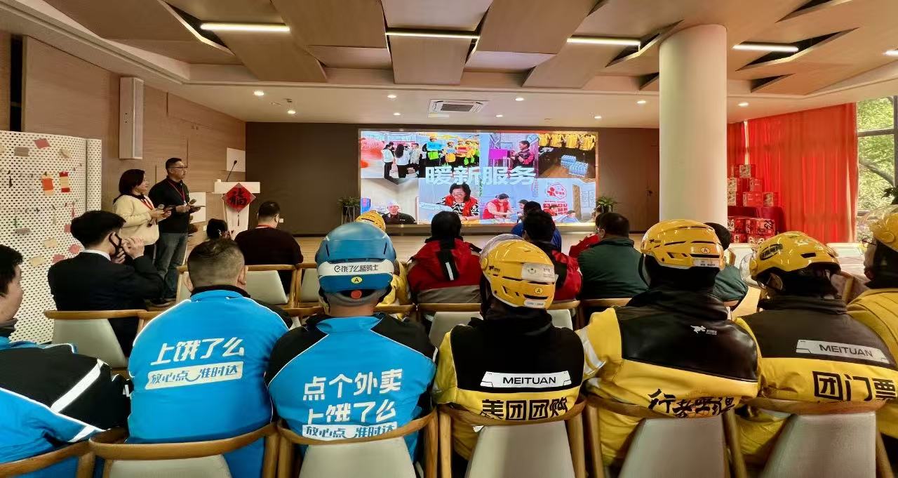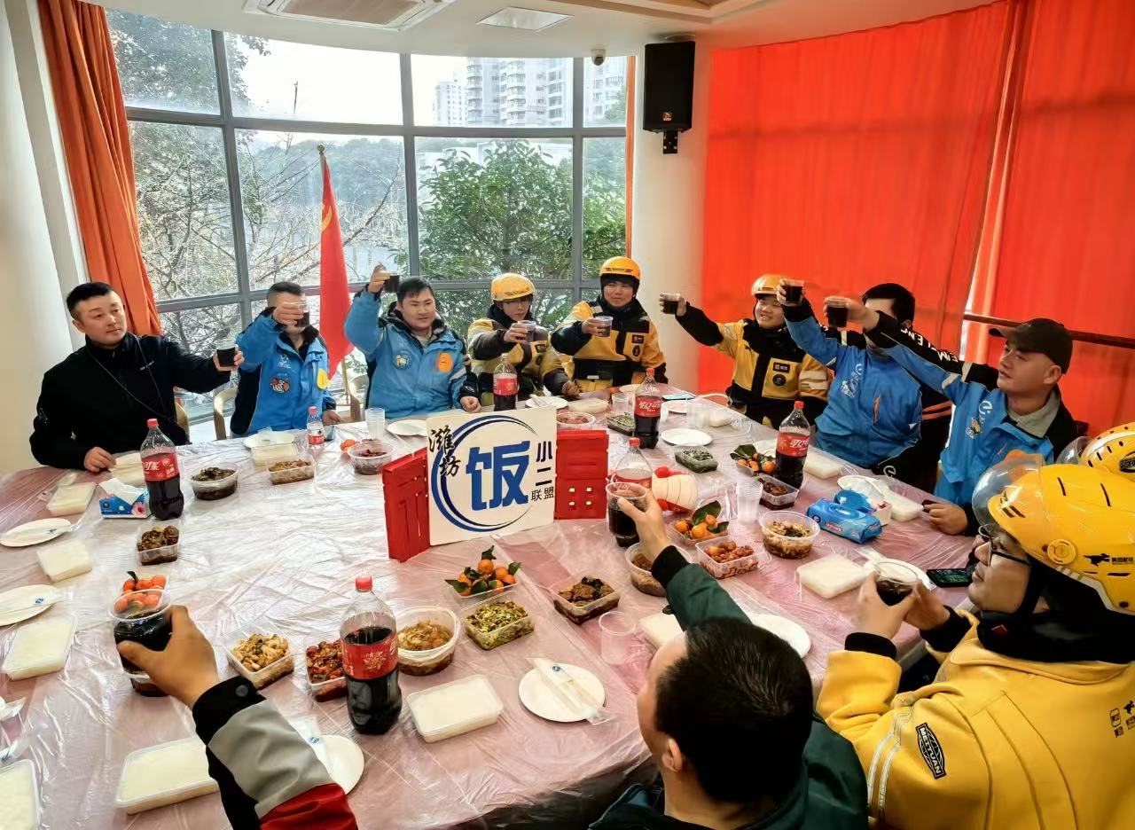 騎手小哥們圍坐在桌旁,臉上洋溢著幸福與滿足。他們互相打趣,分享著過去一年里奔波途中的趣事,歡聲笑語在黨群服務中心的每一個角落回蕩。