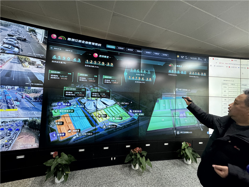 第一站,來到西郊國際市場調控中心,幾塊大屏上滾動播放最新數據,1月20日的站內數據、分布圖一目了然:西郊國際批發市場成交量6590.43噸,成交額12579.39元;江橋批發市場成交量4095.67噸,成交額2216.99萬元;兩個批發市場總交易量10686.1噸,總成交額14796.38萬元……西郊江橋公司總經理顧惠良介紹,每日的白條肉流通追溯,經銷商主體碼點擊可查。