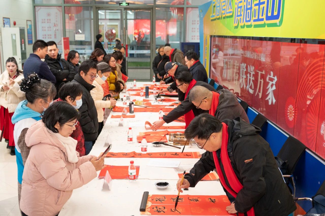 會場外,萬副春聯送萬家活動火熱舉行,書法家們現場書寫對聯,將美好溫暖的祝福送給現場的市民群眾,現場人潮涌動,熱鬧非凡。