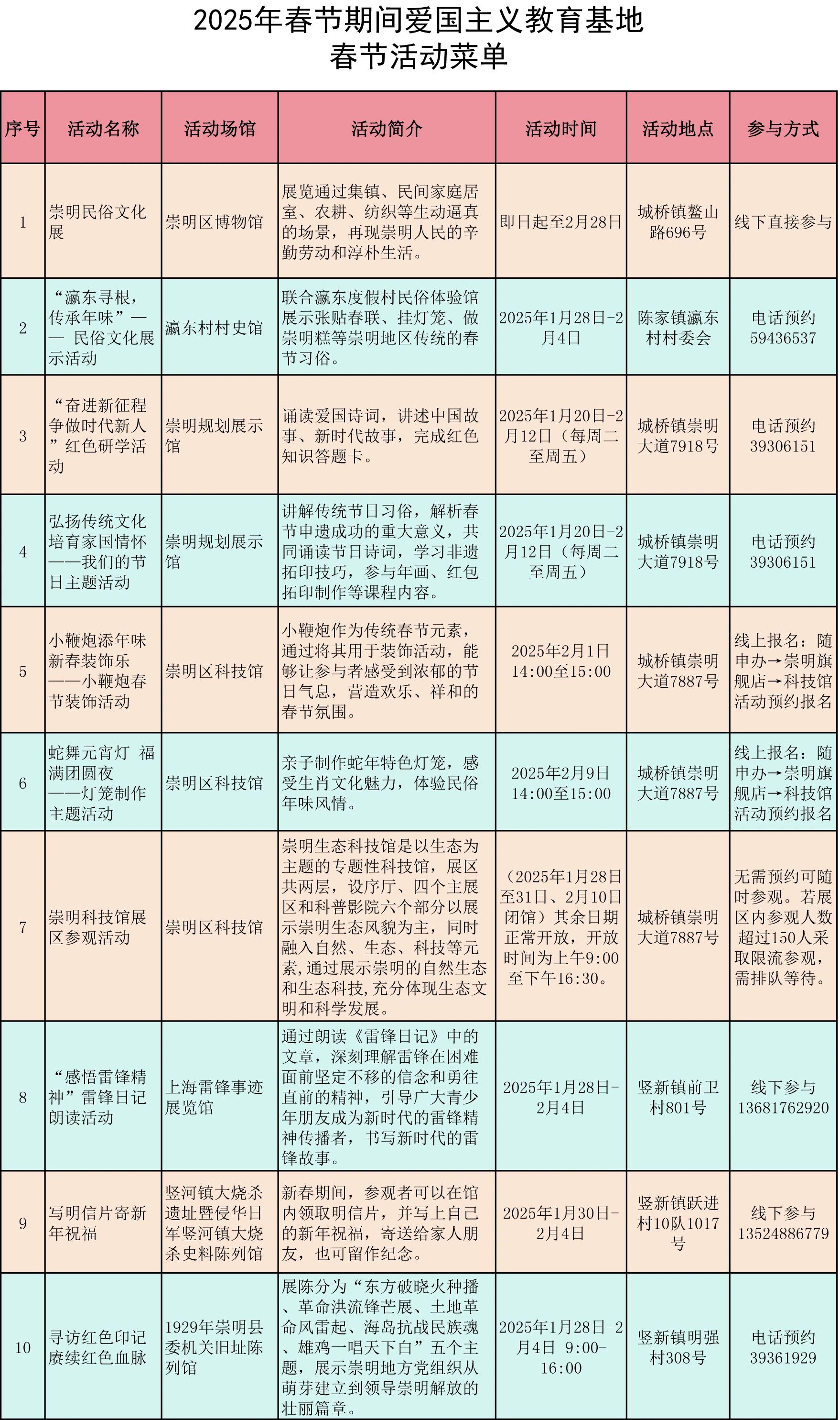 今年是春節被列入聯合國教科文組織《人類非物質文化遺產代表作名錄》后的首個 “非遺版春節”。為進一步豐富節日期間群眾文化生活,弘揚中華優秀傳統文化,崇明區委宣傳部發揮愛國主義教育基地宣傳教育作用,指導全區各級愛國主義教育基地推出春節主題活動,發布新春特色活動和主題展覽,為廣大市民游客奉上豐富精彩的節日 “文化大餐”。詳情戳↓↓↓