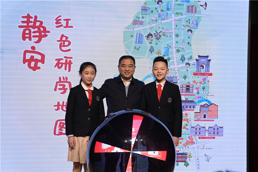 課上,“紅色靜安打卡行”文創發布。圍繞青少年受眾群體需求,該文創產品擁有學習打卡、守護挑戰、聯絡點創建、問答與事件抽取、紅色證考驗等多種的玩法,以更加鮮活的方式普及紅色文化與黨史知識。據悉,今年還將在全區各中小學全面推廣,成為學生在紅色大思政課上的互動教具?,F場,同步發布了“靜安紅色研學地圖(青少年版)”,定位出靜安106處紅色舊址遺址、紅色場館以及文化地標,為孩子們開展紅色研學提供生動規劃與指引。