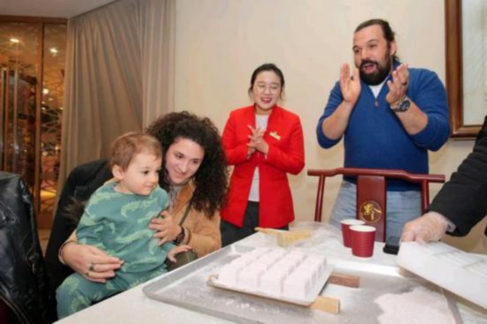 同一天,在金橋碧云社區,“蒸蒸日上 ‘糕’興過年”中外居民迎元宵活動也喜樂開場。30多名中外居民跟著指導老師,用木錘敲打模具,制作了一塊塊“刻”有各種花紋、文字圖案的方形糕點——“戀棠焋糕”。
