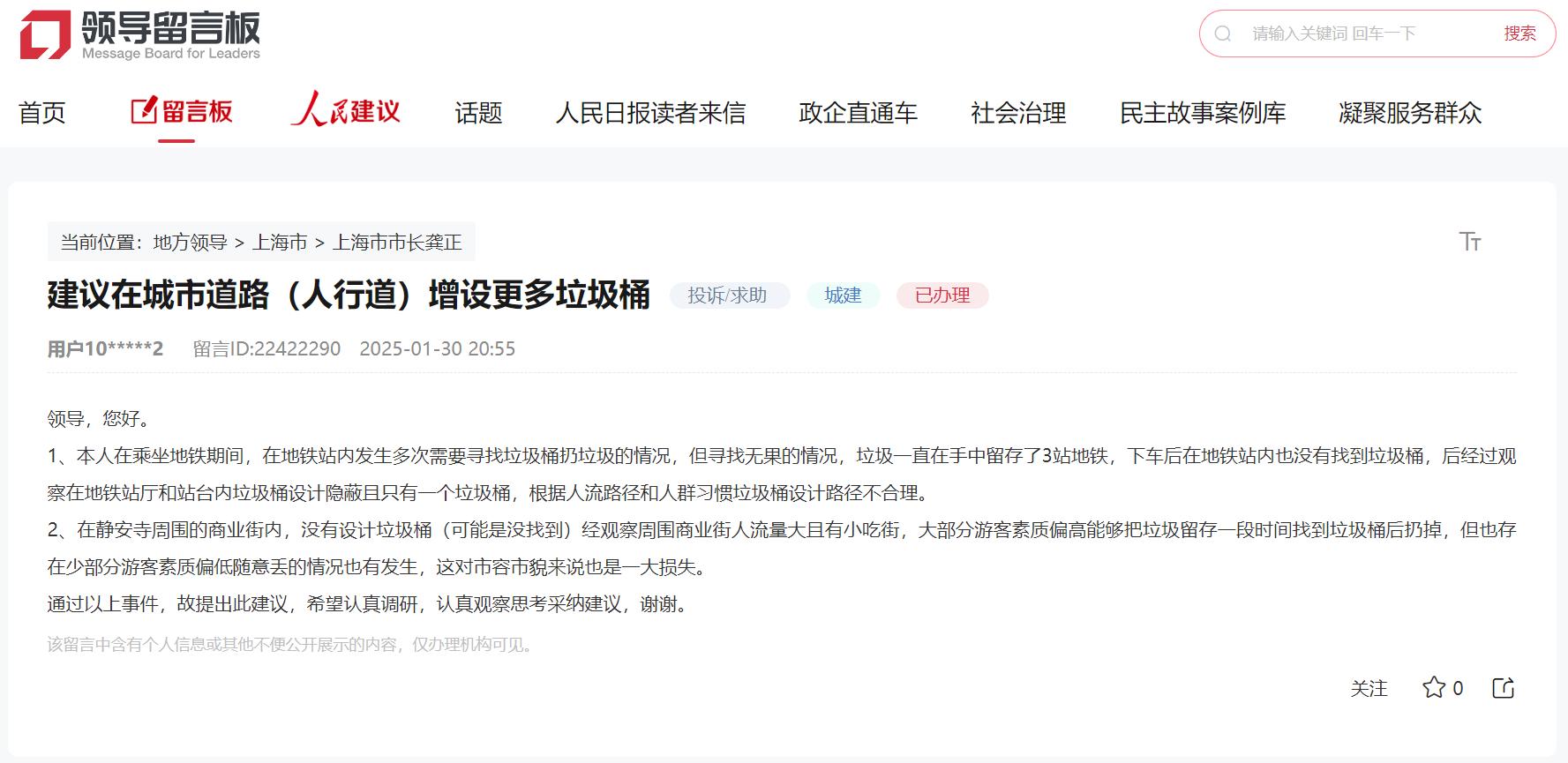 “垃圾在手里存了3站地鐵才扔掉?!苯?,有上海網友通過人民網“領導留言板”留言,建議在城市道路(人行道)、地鐵站內增設更多垃圾桶。
