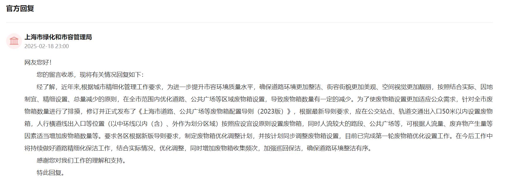 對此,上海市綠化和市容管理局回復表示,經了解,近年來,根據城市精細化管理工作要求,為進一步提升市容環境質量水平,確保道路環境更加整潔、街容街貌更加美觀、空間視覺更加靚麗,按照結合實際、因地制宜、精細設置、總量減少的原則,在全市范圍內優化道路、公共廣場等區域廢物箱設置,導致廢物箱數量有一定的減少。