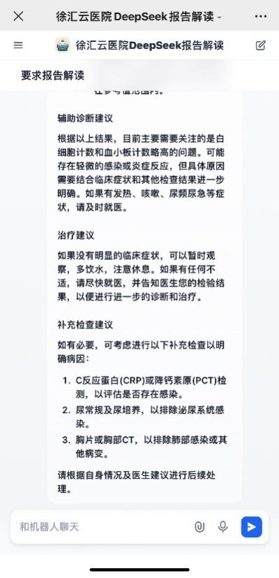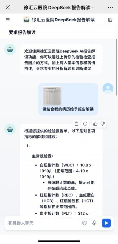 作為互聯網醫院代表,徐匯區中心醫院率先在徐匯云醫院平臺接入DeepSeek大模型,打造體檢報告智能解讀系統。該系統可分析患者近三年的體檢數據,自動識別異常指標趨勢,并生成個性化健康建議。醫生審核后,系統還能聯動互聯網醫院推送隨訪計劃。