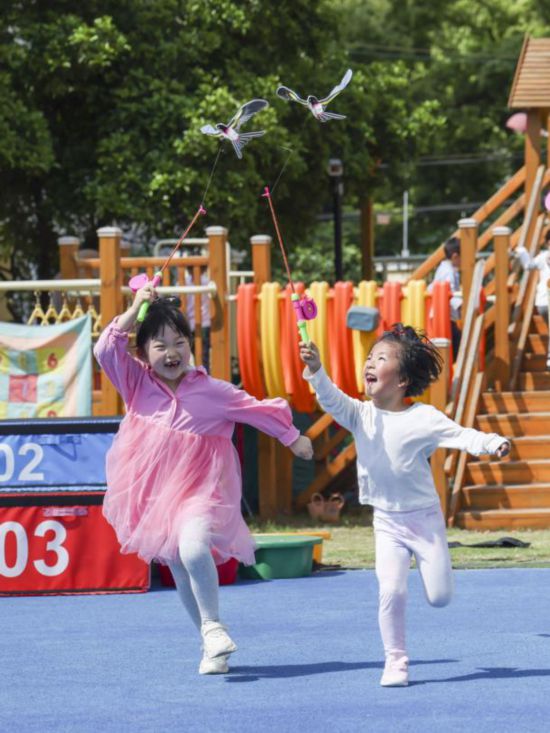 上海市寶山區乾溪幼兒園,小朋友在春日露營會上放風箏。王初攝