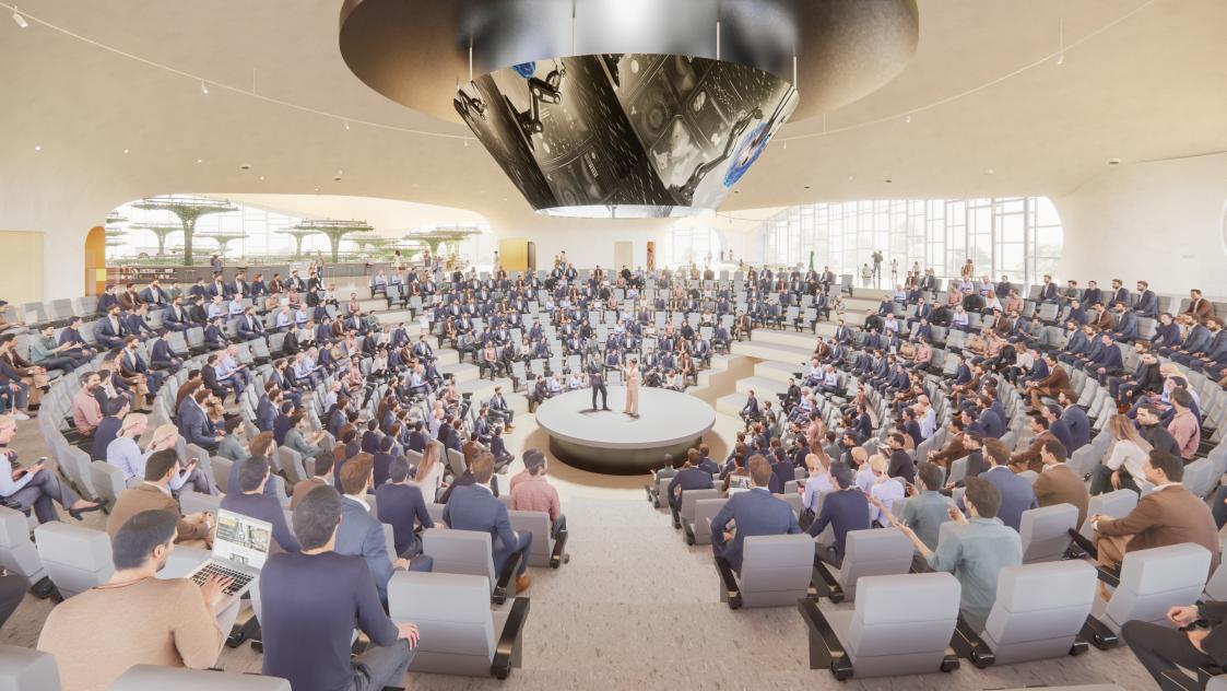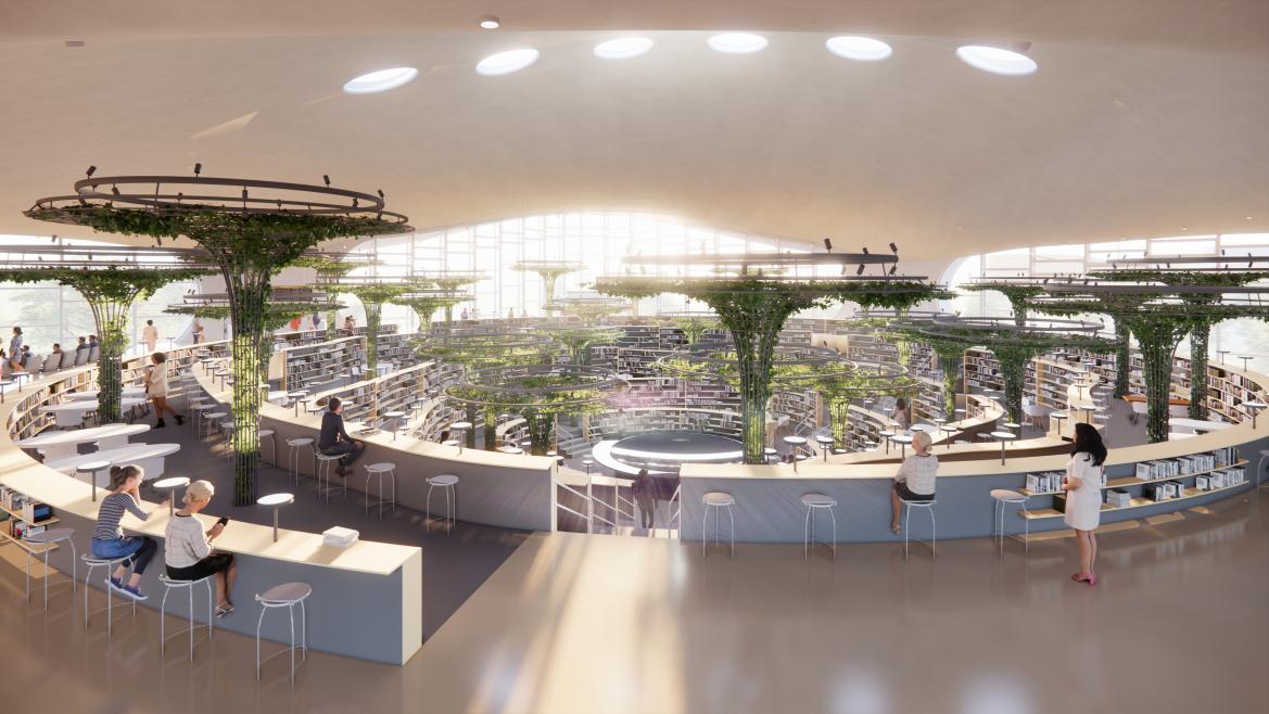 科幻館主體共兩層,一樓的科幻大廳從東方哲學觀中汲取靈感,以科幻藝術裝置展示大國科幻美學與哲思。二樓公共區域與中國前沿科技探索成果、大國重器等熱門科學話題緊密相連,聚焦于深度孵化可持續生長的大國特色的科幻生態圈。位于屋頂的科幻花園以巨型“宇宙電波”裝置向所有遙遠未知的宇宙文明發出人類的友好訊息,傳達出人類永遠擁抱未知的美好愿景。
