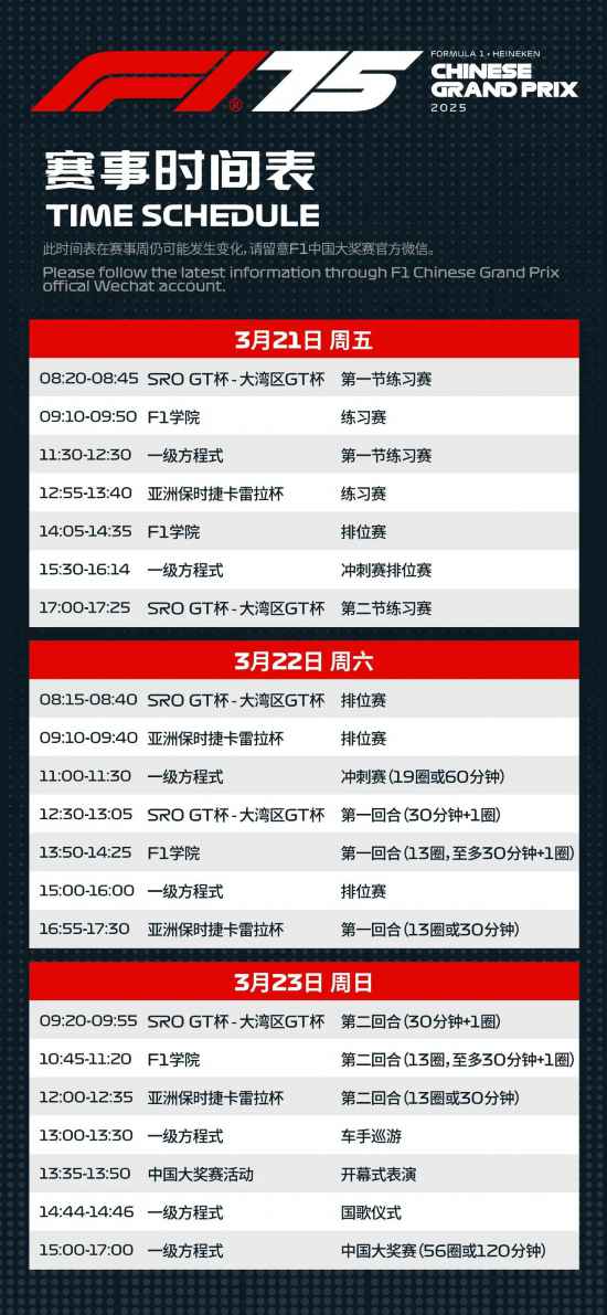 3月21日周五:所有F1車手悉數登場參加第一節練習賽和沖刺賽排位賽。F1學院也在同一天正式拉開新賽季大幕,進行練習賽和排位賽,排位賽成績將決定周六、周日F1學院兩回合正賽的發車順序。