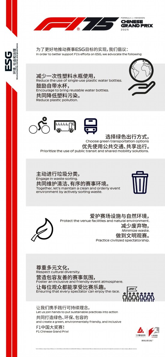 為了更好地推動賽事在環境、社會和治理(ESG)目標上的突破,我們倡議大家踐行可持續理念,共同打造綠色、環保、包容的F1中國大獎賽!